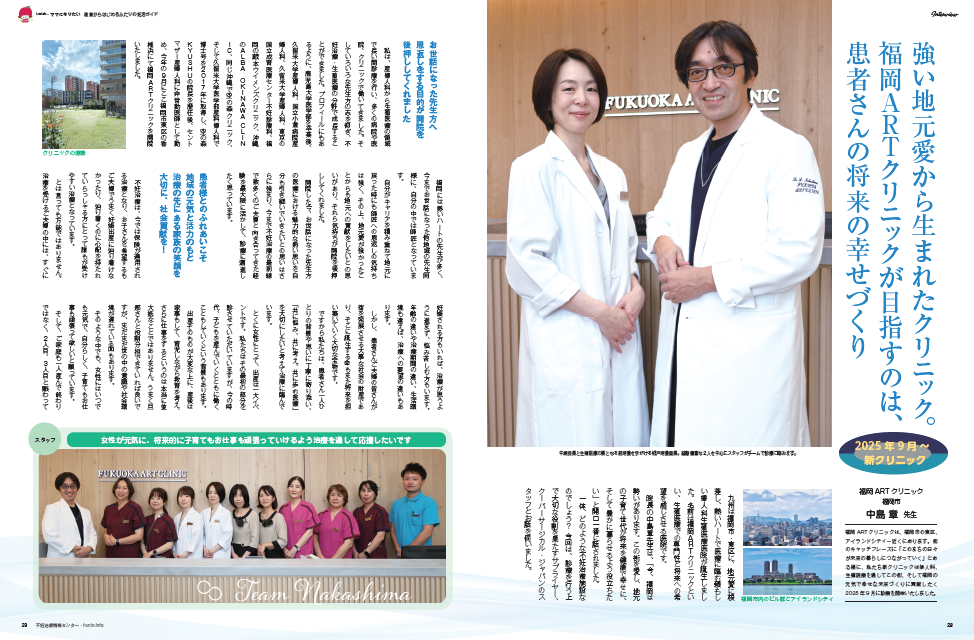院長中島章の開院への思い、そして実際にどのような診療を行っているかを細かくご紹介いただきました。生殖補助医療において重要となる採卵・培養面についても、掲載されております。